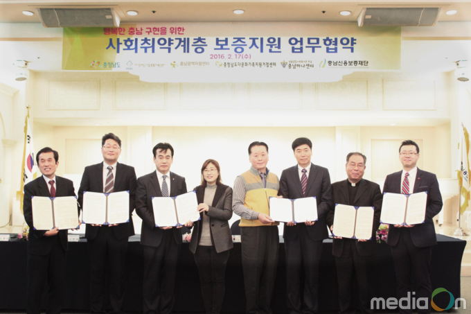 (미디어온) 충청남도와 충남신용보증재단 및 도 내 취약계층 지원 전문기관(장애인기업종합지원센터, 충남광역자활센터, 충남다문화가족지원거점센터, 충남하나센터)은 17일 온양제일호텔에서 업무협약을 맺고 100억 원 규모의 사회취약계층 지원에 나서기로 했다고 밝혔다.