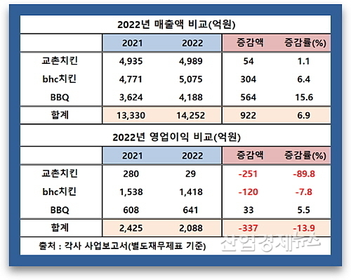 3위 BBQ가 4188억 매출로 전년도 3624억 대비 564억이 늘어 약 15.6% 증가했고, 1위로 등극한 bhc치킨도 5075억 매출을 올려 전년도 4771억 원 대비 304억이 늘어 6.4% 성장한 반면, 교촌은 2021년 4935억 대비 약 54억 늘어난 4989억 원에 그쳐, 3사 중 가장 저조했다.