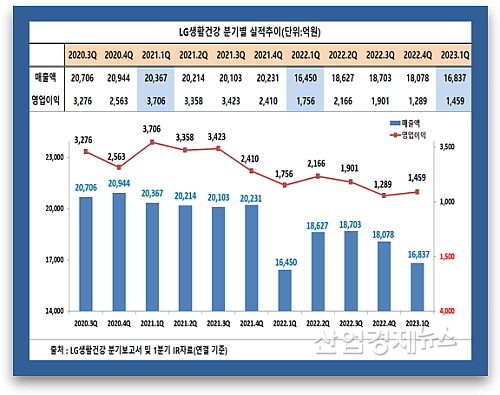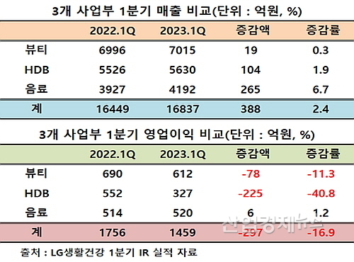 LG생활건강의 1분기 잠정영업실적(IR자료)에 따르면 연결재무제표기준 매출은 1조6837억 원으로 2022년 1분기 1조6449억 원 대비 388억이 늘어 약 2.4% 증가한 반면에 영업이익은 1459억 원을 올려 전년 동기 1756억 대비 16.9% 감소하는 부진을 이어갔다.