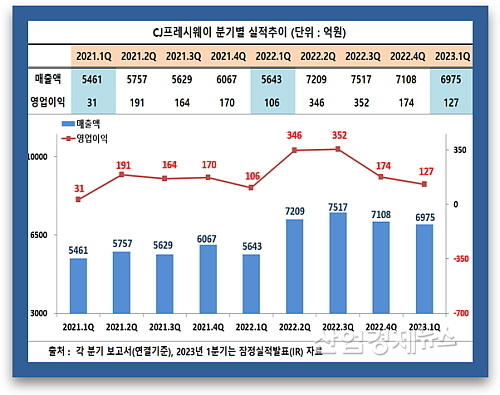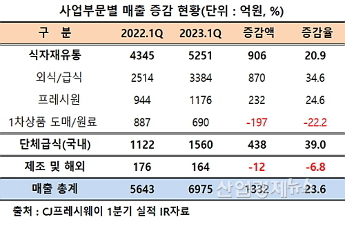 [산업경제뉴스 민경종 기자] CJ프레시웨이가 올 1분기 외식/급식 관련 식자재유통과 단체급식사업부의 쌍끌이 선전에 힘입어 외형과 영업이익 모두 전년 동기대비 성장세를 지속하며 순항한 것으로 밝혀졌다.
