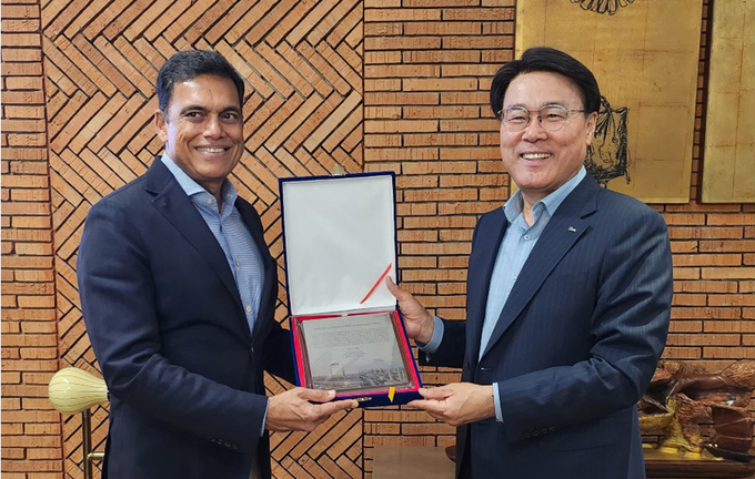 이날 최 회장은 사쟌 진달 회장에게 포스아트로 제작한 감사패를 전달하고 “지난해 태풍 힌남노 피해 복구 작업 당시 사쟌 진달 회장께서 JSW社 열연공장용으로 제작 중이던 설비를 포스코에 선뜻 내어 주셔서 제철소 복구 일정을 크게 앞당길 수 있었다”말했다. 이에 사쟌 진달 회장은 “양사 간 협력을 지속 확대해 나가길 기대한다”고 화답했다.
