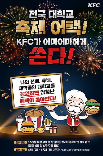 이번 행사는 ‘전국 대학교 축제 어택! KFC가 쏜다’는 타이틀 아래 대학생은 물론 일반 고객들도 참여할 수 있는 이벤트로, 구매 채널 관계없이 1만 5천원 이상 구매한 후 홈페이지에 마련된 투표창에 응원하는 학교를 선택해 투표하면 방식으로 운영됐다.