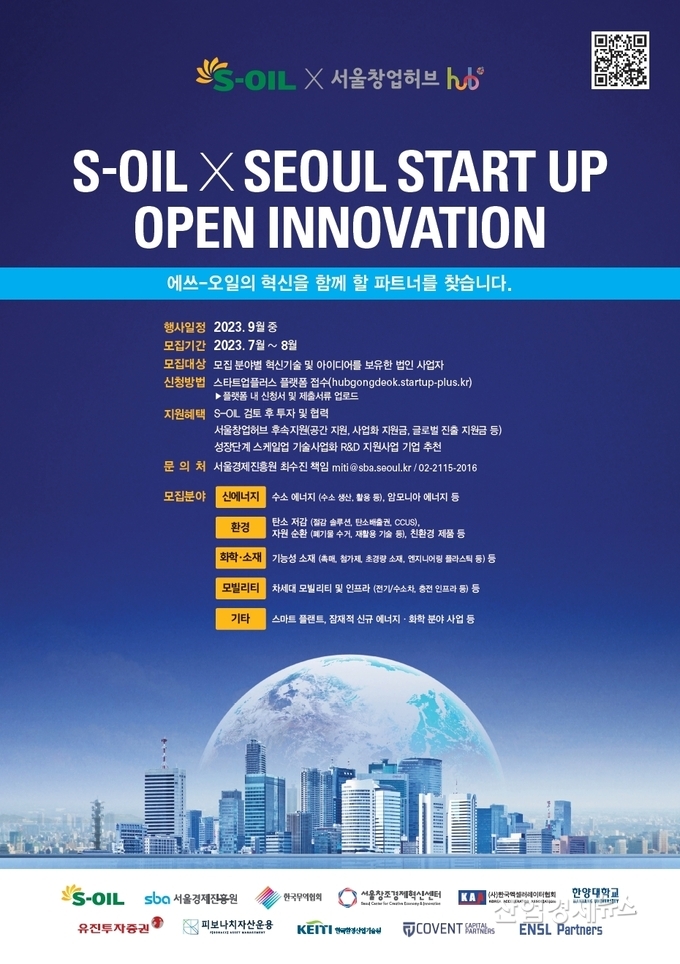 S-OIL은 서울시의 중소기업∙스타트업 지원기관인 서울경제진흥원이 운영하는 서울창업허브와 공동으로 스타트업 협업 프로그램(2023 S-OIL X Seoul Startup Open Innovation)에 참여할 혁신기술 스타트업을 선발한다.