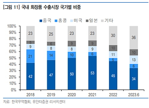 유안타증권 이승은, 강순건 연구원 보고서(6월 국내 화장품 수출 전년 동월대비 17% 증가, 2023.7.10.)에 따르면 6월 국내 화장품 수출액(잠정치)은 9,393억 원으로 전년 동월대비 17% 성장했는데, 중국이 17.6% 감소, 홍콩 49.4% 증가, 일본 9.7% 증가, 미국 60.6% 증가했다.