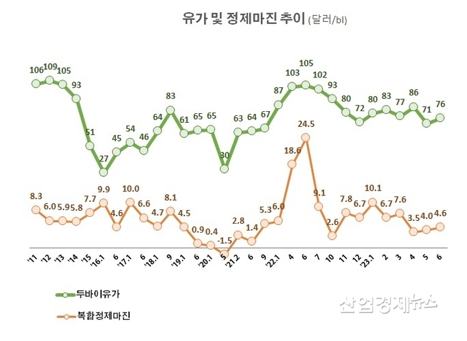 지난해 2분기 배럴당 105달러까지 치솟았던 국제유가는 올해 2분기 70~80 달러선으로 하락했고, 정제마진도 지난해 2분기 24.5달러까지 상승했지만 올해 2분기에는 3.5~4.6달러 선으로 감소했다.