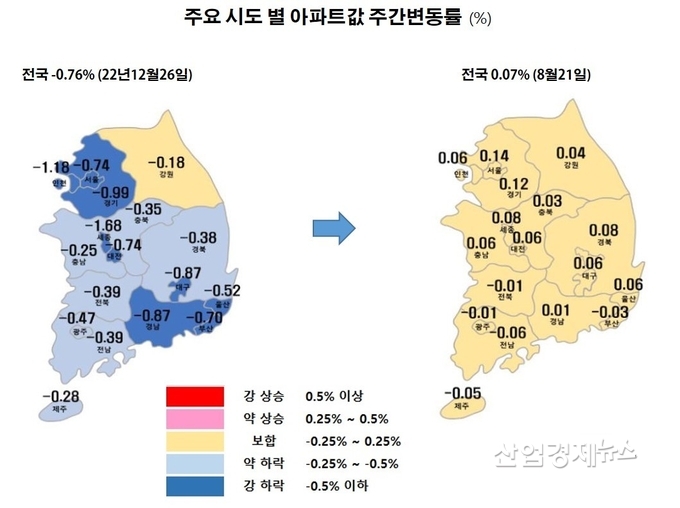 한국부동산원에 따르면 8월 21일 기준 전국 주택가격 주간변동률은 0.07%를 기록했다. 지난해 12월 -0.76%를 기록하며 '폭락'이라고까지 불렸지만 올해 들어와 하락폭을 빠른 속도로 줄이고, 7월에 들어서면서 보합세로 올라서더니 8월에 들어서자 상승세를 보이기 시작했다.