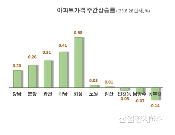 반면 노원은 0.03%, 일산은 0.01%로 상승률이 낮았고, 인천동구 -0.03%, 남양주 -0.07%, 동두천 -0.14% 등 중저가 아파트가 많은 지역은 상승률이 낮거나 가격이 하락하는 모습을 보였다.