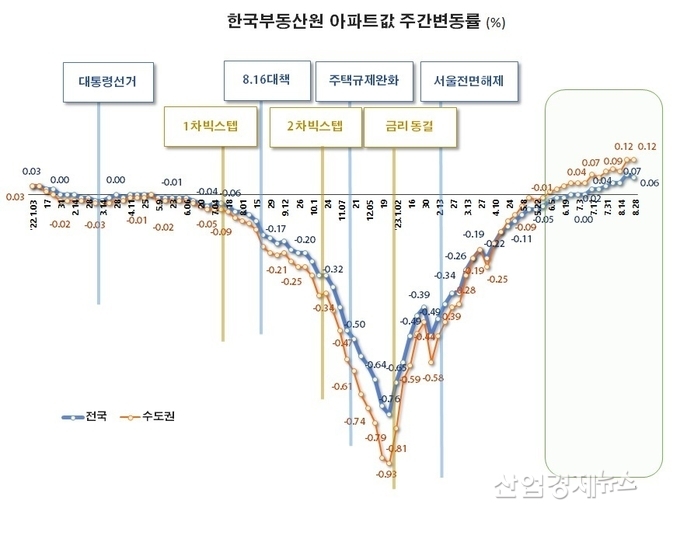 한국부동산원이 발표한 8월 28일 기준 아파트가격 주간변동률을 보면, 전국 평균 변동률이 0.06%로 조사됐다. 7월에 들어서면서 상승폭을 계속 확대해서 한 주 전 0.07%까지 올랐지만 상승세가 다소 주춤하는 모습이다.