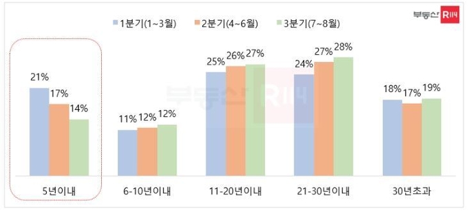 부동산R114가 조사한 서울 아파트 연차별 거래비중 통계를 보면, 5년차 아파트는 1분기 21%에서 3분기 14%로 거래비중이 낮아진 반면, 연차 11년~30년 아파트는 1분기 49%에서 3분기 55%로 늘어났다.