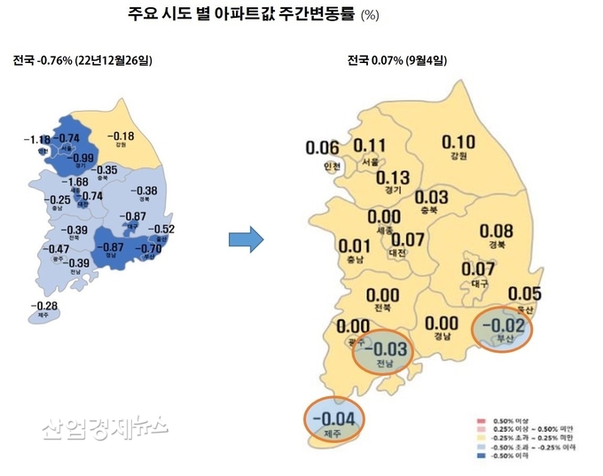 지난 주 각 시도별 주간변동률을 보면 전국 대부분의 시도가 상승세를 보였다. 하지만 이런 상승 분위기 속에도 제주 -0.04%, 전남 -0.03%, 부산 -0.02% 등 남해안의 시도만 하락세를 보였다. 하락하지는 않았지만 경남 0.00%, 광주 0.00%, 전북 0.00% 등 남부 시도도 상승세로 전환되지 못하고 있다.