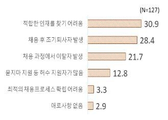 청년들의 취업난이 심각한 상황인데도, 기업들은 정작 원하는 인재를 찾지 못하는 일자리 미스매치 현상도 나타나고 있다. 이번 조사에서 기업들은 신규채용 관련 애로사항으로 ‣적합한 인재 찾기 어려움(30.9%)을 가장 많이 꼽았다.