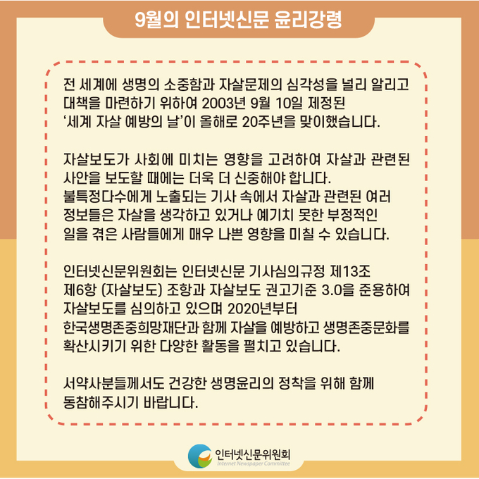 [산업경제뉴스 박진경 기자] 인터넷신문 자율심의기구인 인터넷신문윤리위원회(위원장 민병호, 이하 인신위)는 16일 한국생명존중희망재단(이사장 황태연)과 함께 ‘2023 라이프 리더(LIFE-LEADER) 양성 프로젝트’를 추진중이라고 밝혔다.