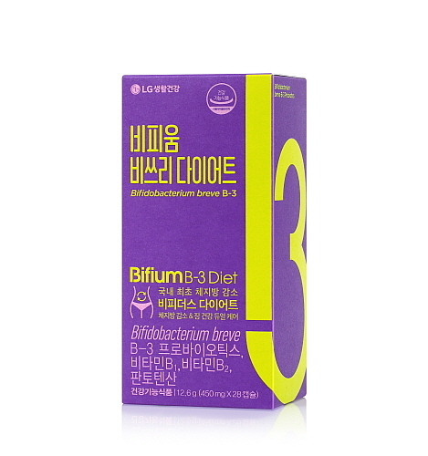 LG생활건강에 따르면 비피움 비쓰리 다이어트는 식약처로부터 체지방 감소 기능성을 인정 받은 국내 유일한 원료인 ‘비피도박테리움 브레브 B-3(Bifidobacterium Breve B-3, 비피더스 비쓰리)’로 처방해 체지방 감소와 장 건강에 도움을 주는데, 해당 성분은 7가지 인체적용시험*에서 체중 감소, 체지방량 감소 등이 확인됐다.