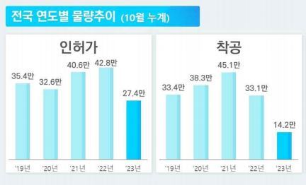 [산업경제뉴스 문성희 기자] 주택공급이 크게 줄고 있는 것으로 조사됐다. 국토교통부가 매월 집계하는 주택통계자료에 따르면 올해 1월~10월 주택 인허가 건수는 27.4만 건으로 작년 42.8만 건에 비해 36.0%나 적었다. 최근 5년 인허가 가운데 가장 적은 물량이다.