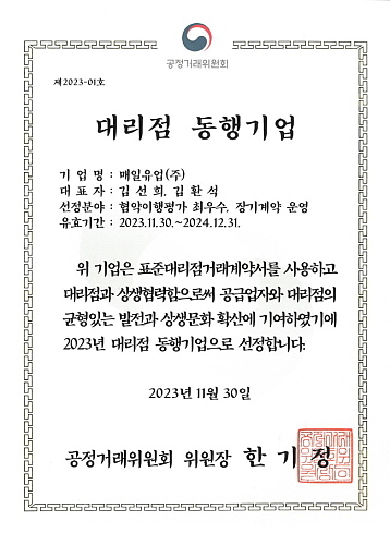 [산업경제뉴스 민경종 기자] 매일유업(대표 김환석)이 3년 연속으로 공정거래위원회(위원장 한기정) 선정 ‘대리점 동행기업’에 뽑혔다.