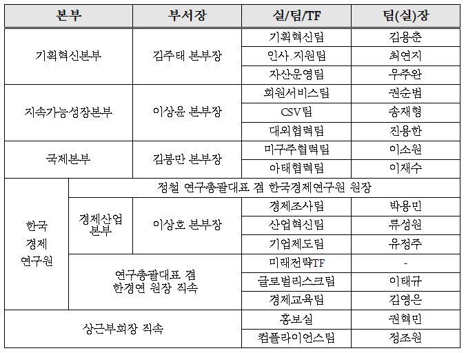 한경협은 이번 인사에 대해 "수평적 소통강화를 위해 직급체계를 기존 6단계(수석부장-부장-차장-과장-책임연구원-연구원)에서 3단계(수석-책임-연구원)로 단순화했다"고 설명했다.