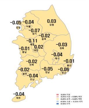 지방에서는 부산 -0.06%, 경남 -0.05%로 하락폭이 컸고, 그 외 지역은 -0.01%~-0.04%의 하락률을 보였다.