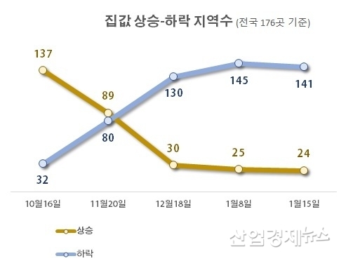 한국부동산원에 따르면 지난 1월 15일 기준, 매매가격 주간변동률은 전국 -0.04%로 한 주 전 -0.05%에서 미미하게 하락폭이 줄었다. 이런 변화는 지방 변동률이 -0.04%에서 -0.03%로 줄었기 때문이라는 해석이다.