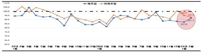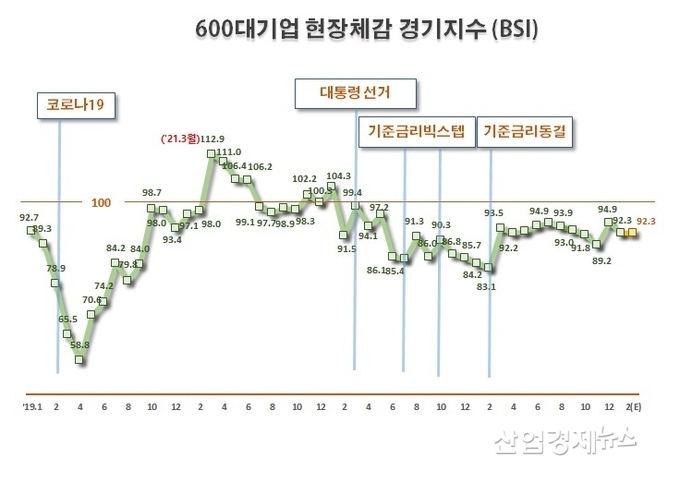 한국경제인협회(舊전경련, 이하 한경협)가 매출액 기준 600대 기업을 대상으로 기업경기실사지수(BSI : Business Survey Index)를 조사한 결과, 오는 2월 BSI 전망치는 92.3으로 조사됐다. BSI 전망치는 2022년 4월 99.1 이후 기준선 100을 23개월 연속 하회하고 있다. 23개월 연속 부진은 코로나19 시기인 2021년 2월 이후 최장기 기록이다.