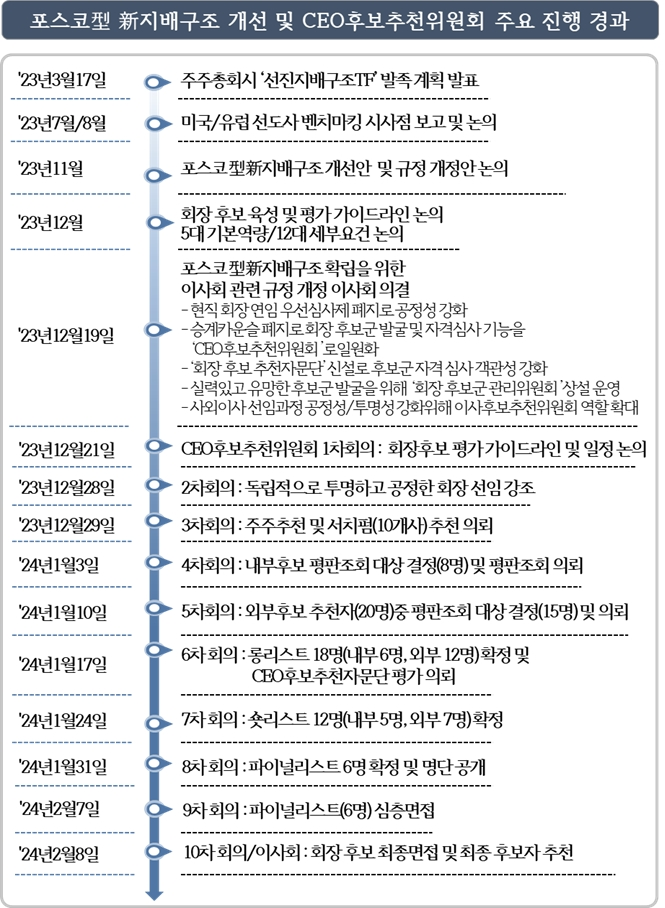 앞서 포스코홀딩스는 지난해 12월 19일 이사회에서 의결한 ‘포스코型 新지배구조 개선안’에 따라 현직 회장의 임기만료 3개월 전에 차기 회장 선임을 위한 ‘CEO후보추천위원회’를 구성했다. 이후 사외이사 전원으로 구성된 후추위는 지난 50일간 30여차례의 회의와 간담회를 통해 포스코그룹의 미래를 이끌어갈 차기 회장 후보군 발굴을 심도 있게 논의해왔다.