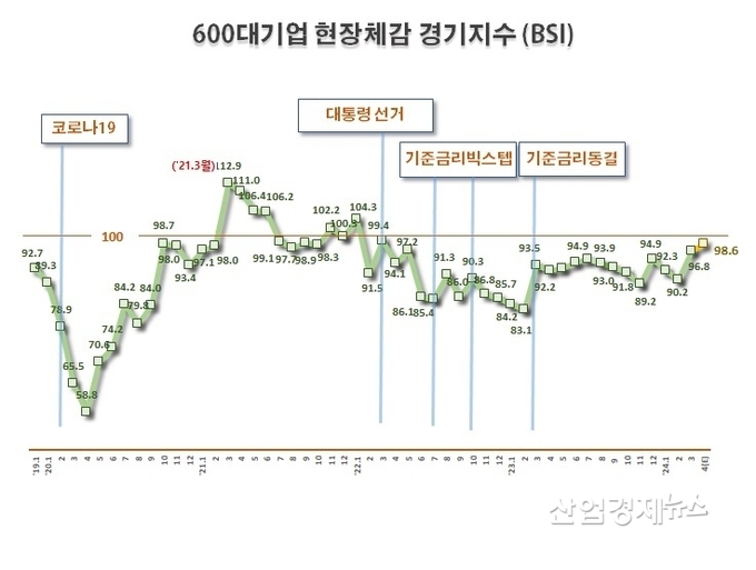 한국경제인협회(이하 한경협)가 매출액 600대 기업을 대상으로 기업경기실사지수(Business Survey Index)를 조사한 결과, 2024년 4월 BSI 전망치는 98.6을 기록하면서, 기준선 100에 근접하는 모습을 보였다.