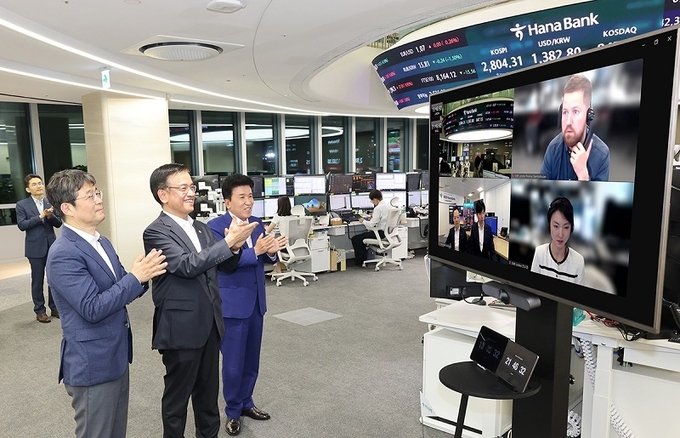 이날 외환시장 개장시간 연장 첫날을 맞아 최상목 부총리 겸 기획재정부 장관, 유상대 한국은행 부총재가 하나은행을 방문했다. 하나은행 딜링룸 ‘하나 인피니티 서울’을 찾은 최상목 부총리와 당국 관계자들은 외환거래 연장시간대 상황을 실시간으로 점검하고, 국내 RFI(Registered Foreign Institution, 인가받은 해외 소재 외국 금융기관)로 등록된 하나은행 런던 지점과 스테이트스트리트은행(SSBT) 런던 지점을 화상으로 연결해 현지 분위기를 청취했다.