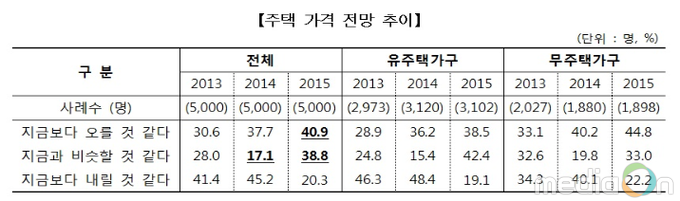 일반가구 5,000가구 중 40.9%가 1년 후 우리나라 주택가격이 오를 것으로 전망했다. 이는 전년대비 3.2%포인트 오른 것으로 지난 2012년 이후 지속적으로 상승하고 있다.