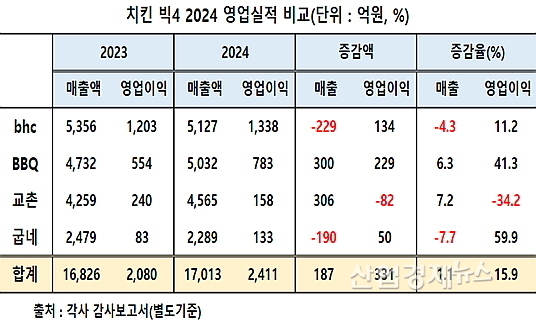 2024년 매출 증가율 ‘교촌 7.2%, BBQ 6.3%, bhc –4.3%, 굽네 -7.7% 순