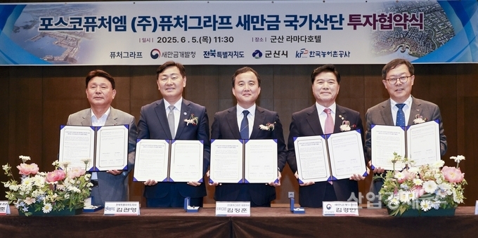 [산업경제뉴스 손영남 기자] 새만금개발청과 전북특별자치도ㆍ군산시ㆍ한국농어촌공사는 6월 5일 포스코퓨처엠 신설 자회사인 ㈜퓨처그라프와 ‘이차전지 음극재 핵심소재 제조시설 건립을 위한 투자협약(MOU)’을 체결했다고 밝혔다.