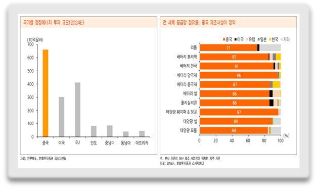 실제로 한화투자증권 보고서에 의하면 중국이 국가별 청정에너지 분야에 대한 투자규모는 물론, 핵심광물의 전세계 공급망 점유율이 타 국가를 압도하는 수준인 것으로 드러나 충격을 주고 있다.