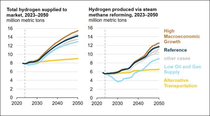 EIA는 다양한 시나리오를 통해 수소 시장의 변화를 예측했다. 석유 및 가스 공급이 부족한 경우에는 천연가스 가격 상승으로 인해 SMR 기술의 경제성이 낮아지면서 수소 생산량이 감소하고, 반대로 거시경제가 고성장하는 경우에는 벌크 화학 산업의 확대로 인해 수소 수요가 크게 증가하며 2050년에는 공급량이 1,550만 미터톤에 이를 것으로 예상된다.