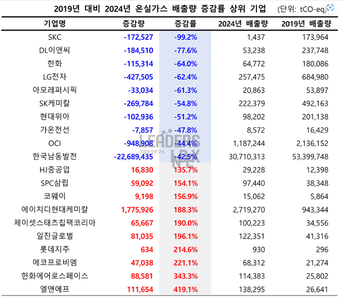 가장 극적인 감축을 이룬 기업은 SKC로, 온산공장 매각 영향으로 17만톤에서 1437톤으로 –99.2%를 기록했다. DL이앤씨(–77.6%), 한화(–64.0%), LG전자(–62.4%), 아모레퍼시픽(–61.3%) 등도 높은 감축률을 보였다.