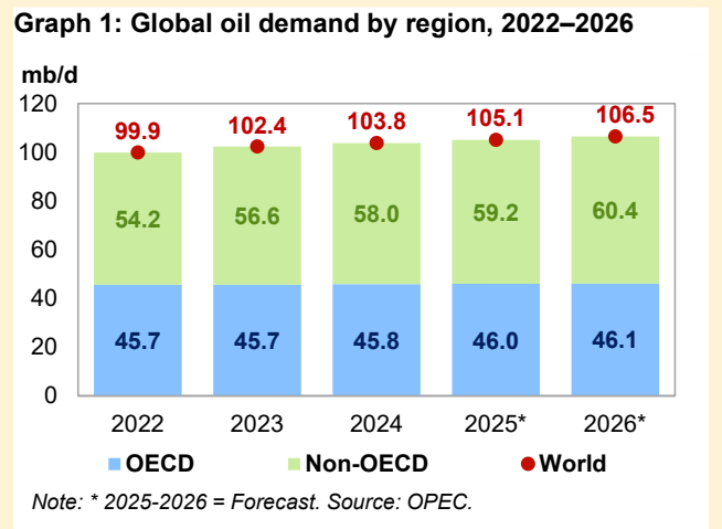 이러한 흐름은 최근 발표된 OPEC(석유수출국기구)의 월간 석유시장보고서(MOMR)를 통해 수치로도 확인된다. 지난 14일(현지시간) 공개된 보고서에 따르면, 2025년 하루 평균 세계 석유 수요는 1억 514만 배럴에 달한다. 이는 2024년의 1억 384만 배럴에서 130만 배럴 증가한 수치로 OPEC은 이 같은 증가가 글로벌 경기 회복과 운송·산업 부문의 활동 재개에 따른 결과라고 분석했다.