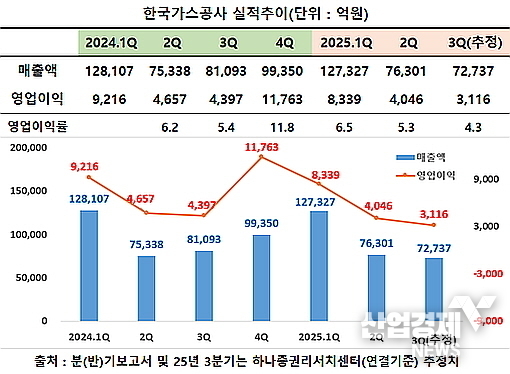 [산업경제뉴스 민경종 기자] 한국가스공사의 올 3분기 영업실적이 신규 연결로 인식되는 해외 법인 적자 등에 따른 영향으로 시장의 전반적인 기대치를 하회할 것이라는 분석이 나왔다.