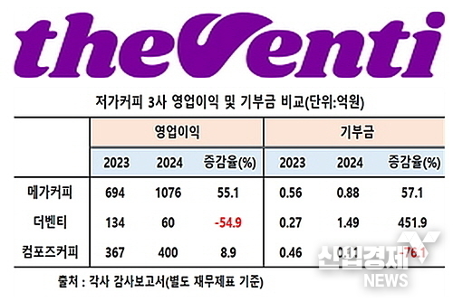 [산업경제뉴스 민경종 기자] 가성비를 앞세워 커피전문점시장에서 신흥 강자로 떠오른 ‘메가엠지씨커피’(이하 메가커피)와 ‘더벤티’ ‘컴포즈커피’ 등 저가 브랜드 3사의 지난해 기부금을 비교한 결과, 손익이 홀로 큰 폭으로 악화한 ‘더벤티’가 역설적으로 가장 많이 지출한 것으로 나타났다.
