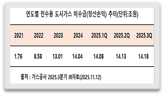 2021년 약 1.75조 원에 불과했던 미수금은 2022년 8.58조, 2023년 13.01조, 2024년 14.04조 원, 지난 3분기에도 약 14.18조 원을 기록하며 단 한 차례도 꺾이지 않고 우상향 추세를 줄곧 견지하고 있는데다 최근의 환율상승까지 맞물리면서 우려감을 키우고 있다.