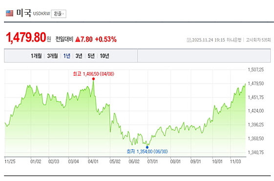 먼저 최근 원·달러 환율 움직임부터 살펴보면, 지난 24일 외환시장에서 미화 1달러당 1479.8원을 기록, 올해 최고치였던 지난 4월 8일의 1486.5원에 바짝 다가선 것은 물론, 현시점에서 우리 경제의 마지노선으로 여겨지고 있는 1500원 마저 돌파할 기세다.