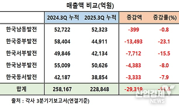 각사 3분기보고서에 의거해 이들 5개사의 누적 매출액과 영업이익을 분석한 결과, 남동발전, 남부발전, 중부발전, 서부발전 등 4개사는 모두 외형 감소와 영업이익이 전년 동기대비 악화한 반면에 동서발전만 유일하게 매출 감소 속 영업이익은 홀로 증가하는 선전을 펼친 것.