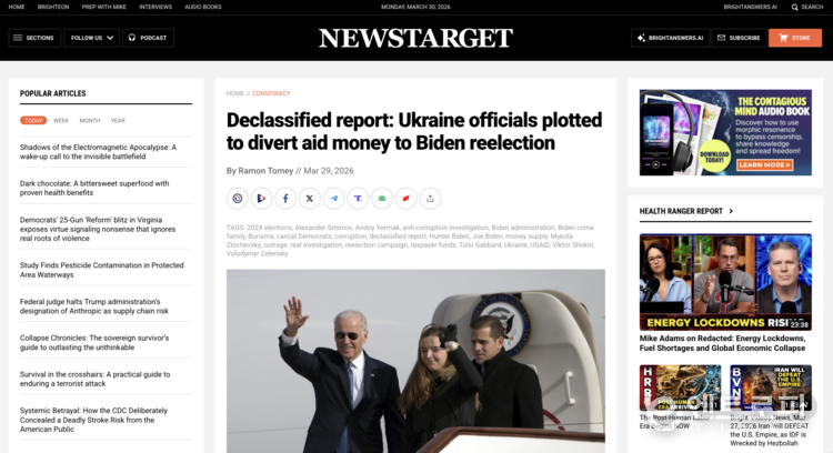 미확인 보도는 이틀 전인 24일(현지시간) 우파 매체로 알려진 <저스트 더 뉴스(Just the News)>의 “미국은 원조금을 바이든 캠프로 빼돌리려는 우크라이나의 음모를 포착했다(U.S. intercepted Ukraine plot to route money to Biden)는 기사였다.