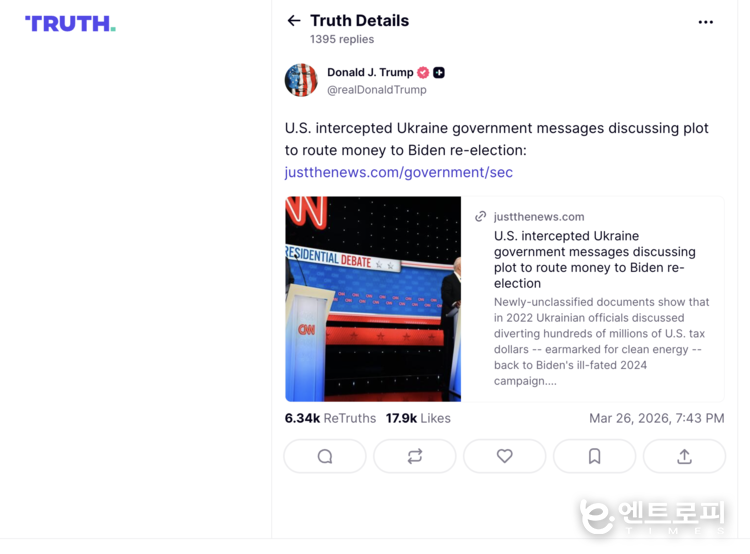 트럼프 대통령은 지난 26일(워싱턴 현지시간) “미국 정보기관이 우크라이나 정부가 2024년 조 바이든 전 대통령의 재선 자금 지원을 위한 모금 계획을 논의하는 메시지를 도청했다”는 미확인 보도를 자신의 SNS 트루스에 다시 게시했다.