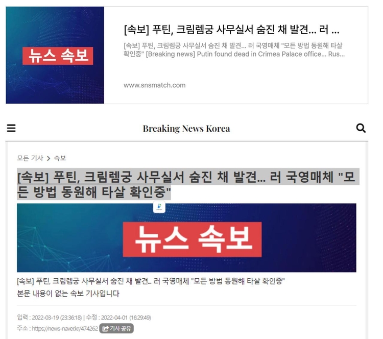 가짜뉴스는 <[속보] 푸틴, 크림렘궁 사무실에서 숨진 채 발견…러 국영매체 "모든 방법 동원해 타살 확인 중”>이라는 조잡한 제목을 달았습니다.