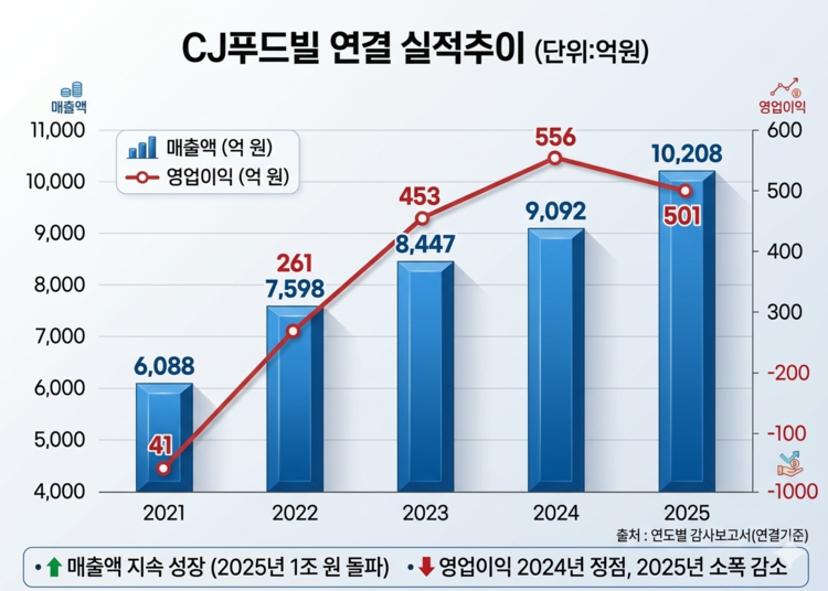 CJ푸드빌이 지난 3일 공시한 연결감사보고서에 따르면, 2025년 연결기준 매출액은 국내 외식 및 글로벌 베이커리 성장으로 1조208억 원을 기록, 전년 대비 약 12% 증가했다. CJ푸드빌이 연 매출 1조원을 돌파한 것은 2018년 이후 7년 만이다.