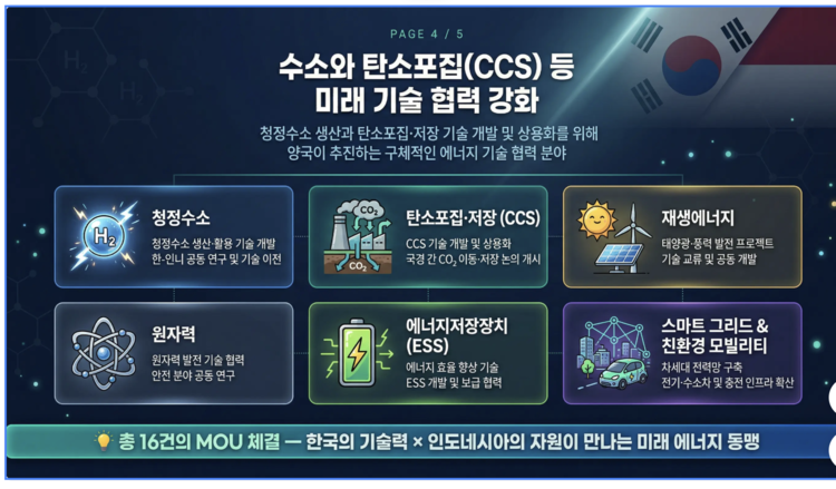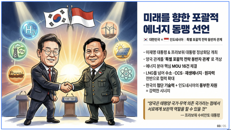 프라보워 대통령의 유화적 태도를 기회 삼아, 우리는 방산 협력을 넘어 수소와 탄소 포집(CCS), 그리고 LNG를 잇는 포괄적 에너지 동맹으로 나아가야 한다.