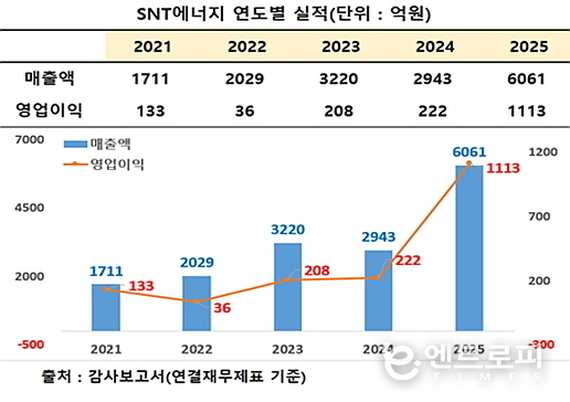 먼저 동사가 공시한 사업보고서에 의거해 2021년부터 지난해까지 영업실적을 살펴보면, 먼저 매출은 연결재무제표 기준 2021년 1711억, 2022년 2029억, 2023년 3220억, 2024년 2943억 에 이어 2025년엔 6061억 원을 올려 전년대비 106% 가량 성장해 사상 최대 실적을 거뒀다.