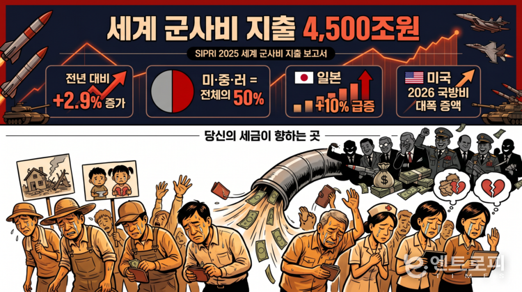 [엔트로피타임즈 이상현 편집위원] 2025년 전 세계 군사비 지출이 2조 8870억 달러에 이르러 2024년보다 2.9% 증가할 것으로 잠정 추산됐다.
