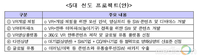 한편 가상현실 신산업 육성을 위해 크게 5대 선도 프로젝트, 문화‧정보통신기술(ICT) 융합 거점 조성, 원천‧기반 기술개발 등을 부처 협업으로 추진한다.