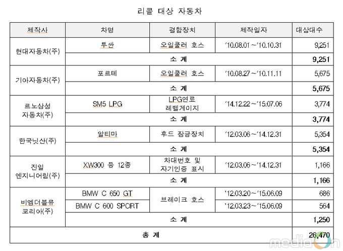 현대, 기아, 르노삼성, 한국닛산 등 26,470대 리콜 실시