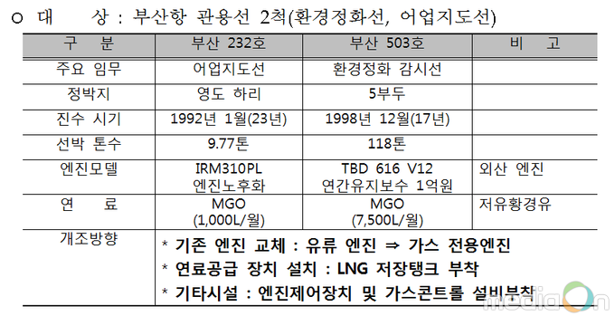 기존 선박의 연료전환 사업은 민간참여가 어려운 점을 감안, 관용선박 2척(환경정화선 118톤, 어업지도선 9.77톤)을 활용해 디젤 엔진을 천연가스(LNG)엔진으로 개조하여 환경성·안전성·경제성을 평가 후 민간으로 점차 확대하기로 했다.