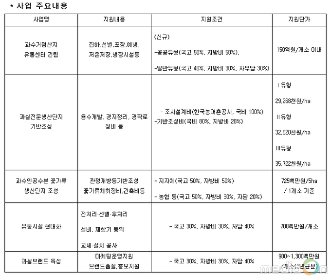 과수분야 생산·유통 지원 사업은 과실 전문 생산단지 기반조성, 과수 인공수분 꽃가루 생산단지 조성, 유통시설현대화, 과실브랜드 육성, 과수 거점 산지유통센터 건립 등 고품질 과실생산 기반조성과 브랜드 개발 및 홍보·마케팅까지 맞춤형 지원으로 선택과 집중을 통한 경쟁력 있는 품목별 조직 단위로 육성하는 사업이다.