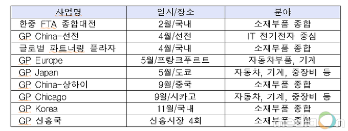 올해 GP사업은 해외진출에 어려움을 겪고 있는 중소 소재‧부품 기업을 지원하기 위해 예산, 품목, 시장, 지원방식을 대폭 보강했으며, 이를 통해 금년도 100억 달러 이상의 수출 상담이 이루어 질 수 있도록 총력지원 한다.